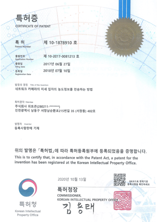 Patent certificate 네트워크카메라 미세입자 농도정보를 전송하는 방법